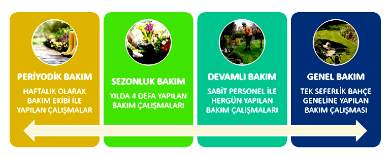 Ayrıca peyzaj projesi yaptığımız bahçenin aylık periyodik bakımlarında, deforme olmuş çimlerin yerinden çıkarılıp tercihe göre rulo çim veya tohumlama yöntemi ile tamirini, budama gerektiren ağaç veya çalıların budanmasını, gübreleme, ilaçlama ve çim kesimini biz yaparız. Bahçenizde kesim zamanı gelen çiçeklerin kesilip vazoya yerleştirilmesini ve çıplak ayakla çimlere basmanın zevkini de siz yaşayabilirsiniz.